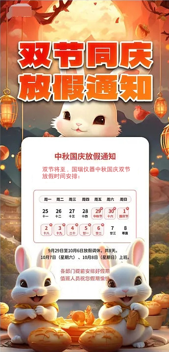 根據(jù)《國(guó)務(wù)院辦公廳發(fā)布關(guān)于 2023 年部分節(jié)假日安排的通知》,現(xiàn)將國(guó)瑞儀器2023年中秋國(guó)慶假日安排通知如下:
