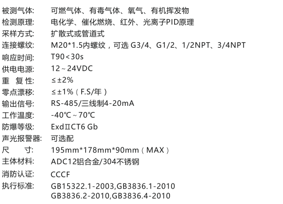 結(jié)構(gòu)模塊化、維護(hù)方便,接線安裝簡(jiǎn)單國(guó)瑞智能傳感器平臺(tái),可即插即用,無需現(xiàn)場(chǎng)標(biāo)定快速響應(yīng)、測(cè)量精度高,運(yùn)行穩(wěn)定的檢測(cè)儀器通過防爆認(rèn)證、防護(hù)等級(jí)IP65、防腐蝕性高、抗電磁干擾豐富的傳感器量程選擇,可以滿足客戶的要求智能傳感器平臺(tái),可即插即用,離線標(biāo)定LCD實(shí)時(shí)顯示氣體濃度,有儀器狀態(tài),故障和通訊異常提示功能可設(shè)置高低報(bào)警點(diǎn),兩級(jí)聲光報(bào)警兩路繼電器可以控制外圍設(shè)備(如風(fēng)機(jī)和聲光報(bào)警器)動(dòng)作產(chǎn)品選擇材質(zhì)優(yōu)秀,具有良好的密封性,防腐性,防爆和抗磁干擾強(qiáng)儀表具用4-20MA輸出與RS-485輸出可以與GRI-8000系列和GRI-9800系列報(bào)警主機(jī)組網(wǎng)使用可以與GRI-9802單點(diǎn)報(bào)警主機(jī)組網(wǎng),每點(diǎn)匹配,點(diǎn)點(diǎn)組合。