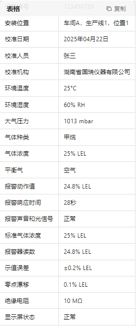 - 報警動作值:記錄報警器發(fā)出報警信號時的氣體濃度值。